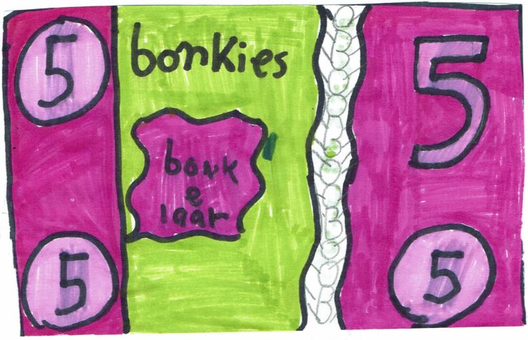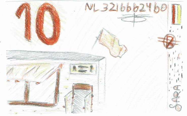 Enthousiast gingen ze in les 2 aan de slag met het schetsen van het eigen briefpapier, de biljetten van 1 (ontwerp Livia), 5 (ontwerp Byoux) en 10 (ontwerp Lara) bonkies. Les 3 was het uitdelen van de eerste biljetten. Valsemunters bestendig gemaakt met een reliëfstempel, bewaard in een afsluitbare la van de juf. Want dat was de les van de eerste keer dat deze lessen waren gegeven, door mijn collega Mark Sanders op de Jenaplanschool Wittevrouwen in Utrecht, waar de eerste oplage Yena’s in zijn geheel werd ontvreemd.