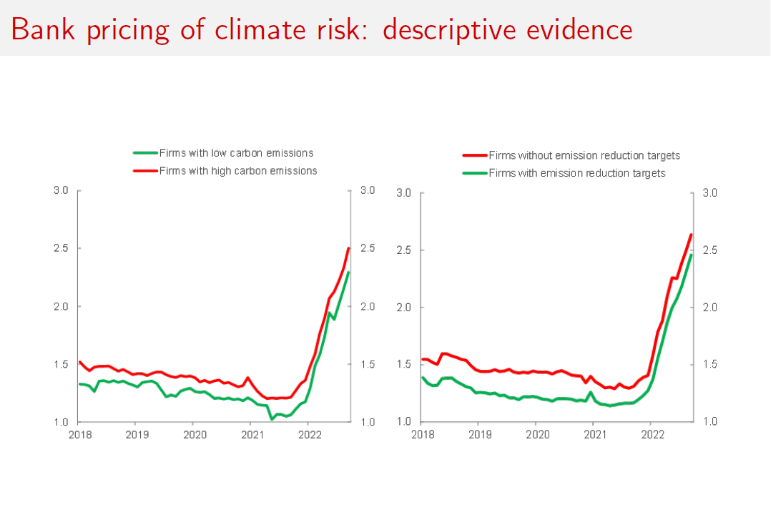 Moreover, their study also looks at the dynamic effect of monetary policy. When the ECB raises interest rates by 25 basis points, high-polluting firms see their borrowing costs increase by 2 basis points more than the average, while loans to firms with climate commitments rise by 9 basis points less.