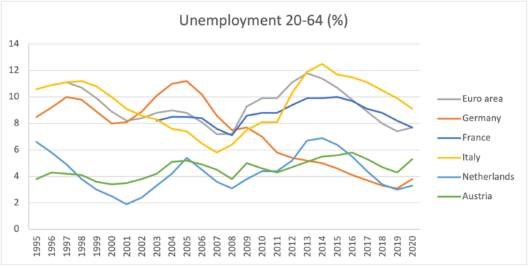 There are several explanations that have been put forward for these different results. One is that the strong emphasis on cost reduction in Italy has reduced public investments and also domestic demand in Italy itself, which led to economic stagnation (see e.g. Baccaro & D’Antoni, 2020). Thanks to the reduction of job protection, downturns also lead to immediate lay-offs, whereas in Germany employment moves from the manufacturing to the services sector, which is less dependent on export but where wages are lower. Lower unit labour costs also make it less interesting to invest in education and training which in the long run improve productivity.