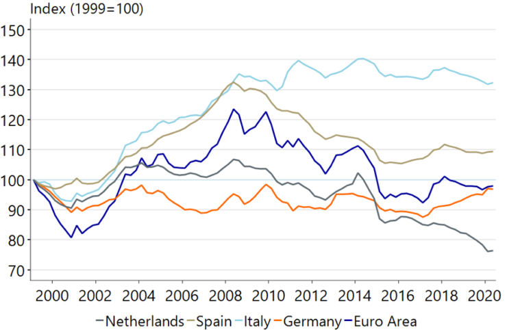 Another factor is that as part of a currency zone the euro’s exchange rate is not necessarily the optimum for all of its member states. Comparing Real Effective Exchange Rates (REER, imaginary exchange rates based on unit labour costs and weighted according to individual Member States’ trade volumes with countries in the rest of the world, see e.g. Rabo, 2020) it can be argued that the Euro has become ever more expensive for Italy and other countries in the South because it makes their exports too expensive, whereas the reverse holds for countries like Germany and especially the Netherlands.