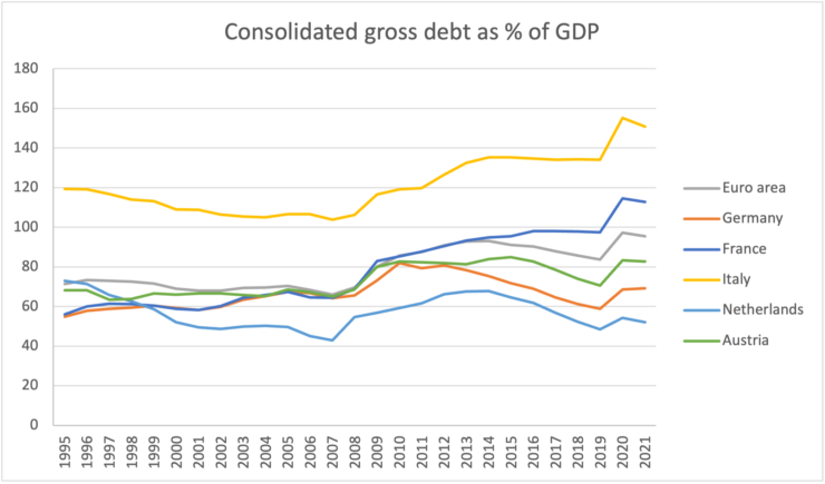 As the picture below (data from Eurostat, extracted 23-9-2022) shows, Italy managed to bring down its legacy debt from the nineteen eighties by almost 20% until the financial crisis started in 2008.