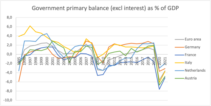 The country also maintained a primary government surplus (i.e. excluding interest payments) almost consistently between 1992 and the beginning of the covid crisis (exceptions are 2009-2010), performing better than even the most vocal of the frugal countries (see picture below, data from AMECO extracted 24-9-2022).