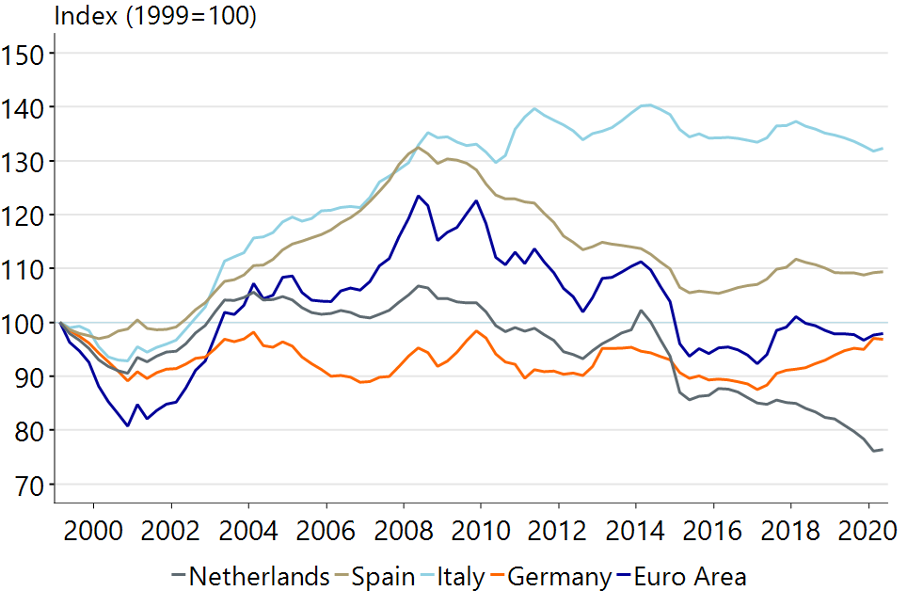 Another factor is that as part of a currency zone the euro’s exchange rate is not necessarily the optimum for all of its member states. Comparing Real Effective Exchange Rates (REER, imaginary exchange rates based on unit labour costs and weighted according to individual Member States’ trade volumes with countries in the rest of the world, see e.g. Rabo, 2020) it can be argued that the Euro has become ever more expensive for Italy and other countries in the South because it makes their exports too expensive, whereas the reverse holds for countries like Germany and especially the Netherlands.