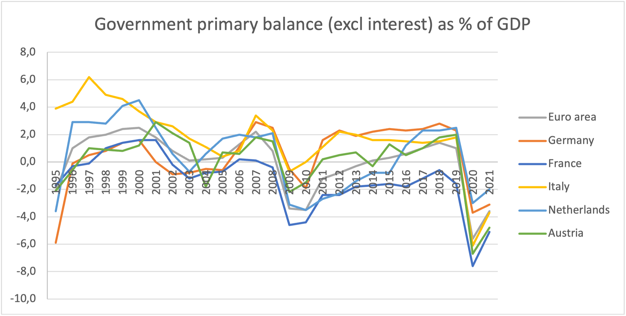 The country also maintained a primary government surplus (i.e. excluding interest payments) almost consistently between 1992 and the beginning of the covid crisis (exceptions are 2009-2010), performing better than even the most vocal of the frugal countries (see picture below, data from AMECO extracted 24-9-2022).